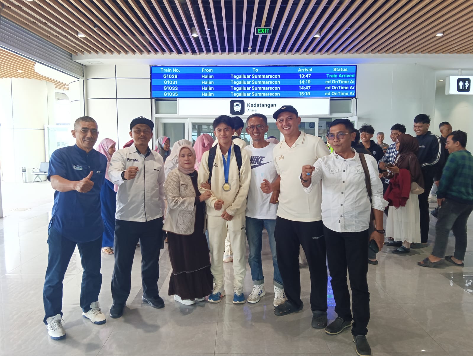 Penjemputan atlit timnas Futsal U-16 asal Garut sekembalinya dari Thailand atas nama Alfian Nurhayadi atau akrab dipanggil Uden hari ini, Rabu (31/12/25) di stasiun kereta cepat Tegal Luar disambut meriah.